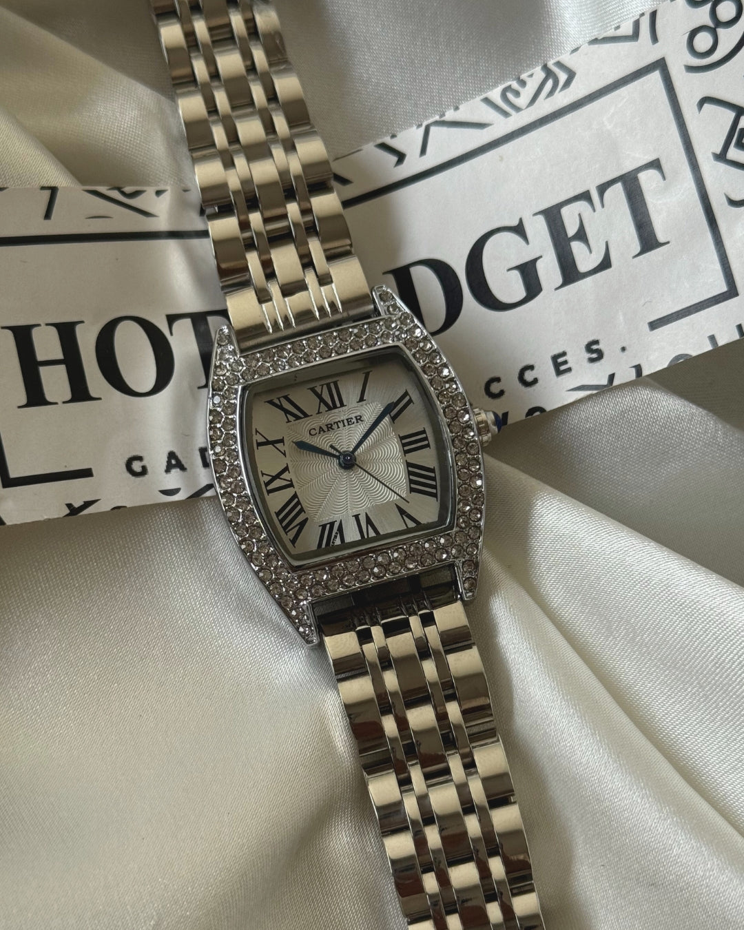 A sleek and sophisticated analog watch featuring diamond embellishments, with an elegant design that exudes timeless charm and adds a luxurious touch to every outfit.