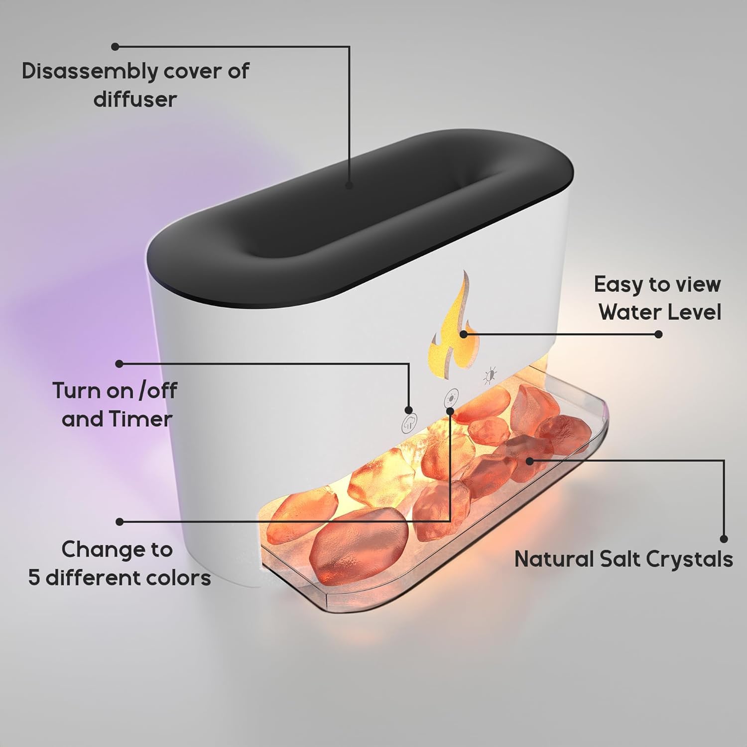 🌈 Customizable Modes – Choose from two mist modes and ambient lights (cool blue & warm flame).