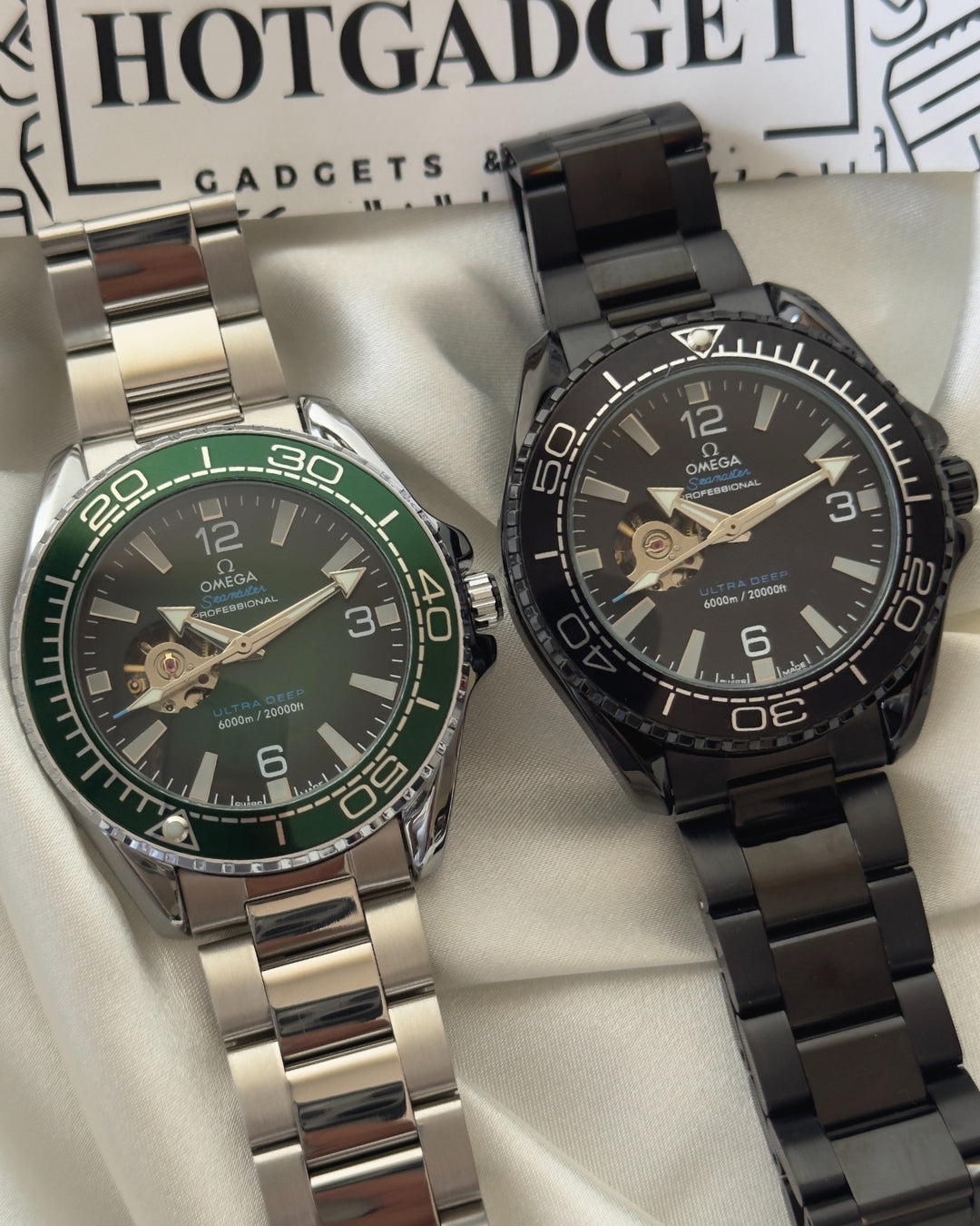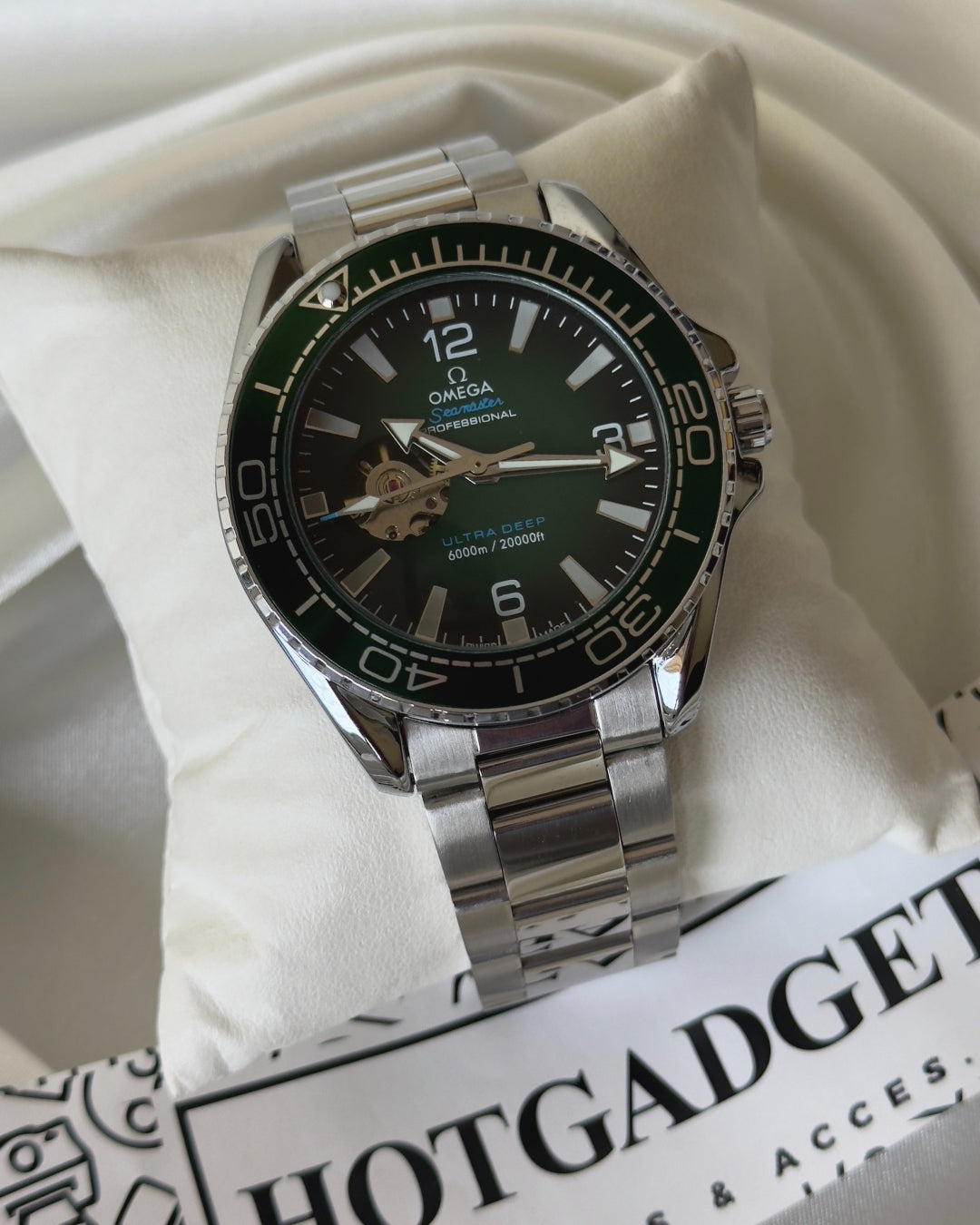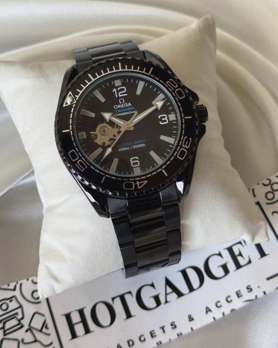 This Planet Ocean Chronograph Watch has a black dial and bezel with subtle orange accents, adding a pop of color to its sleek and sporty design.