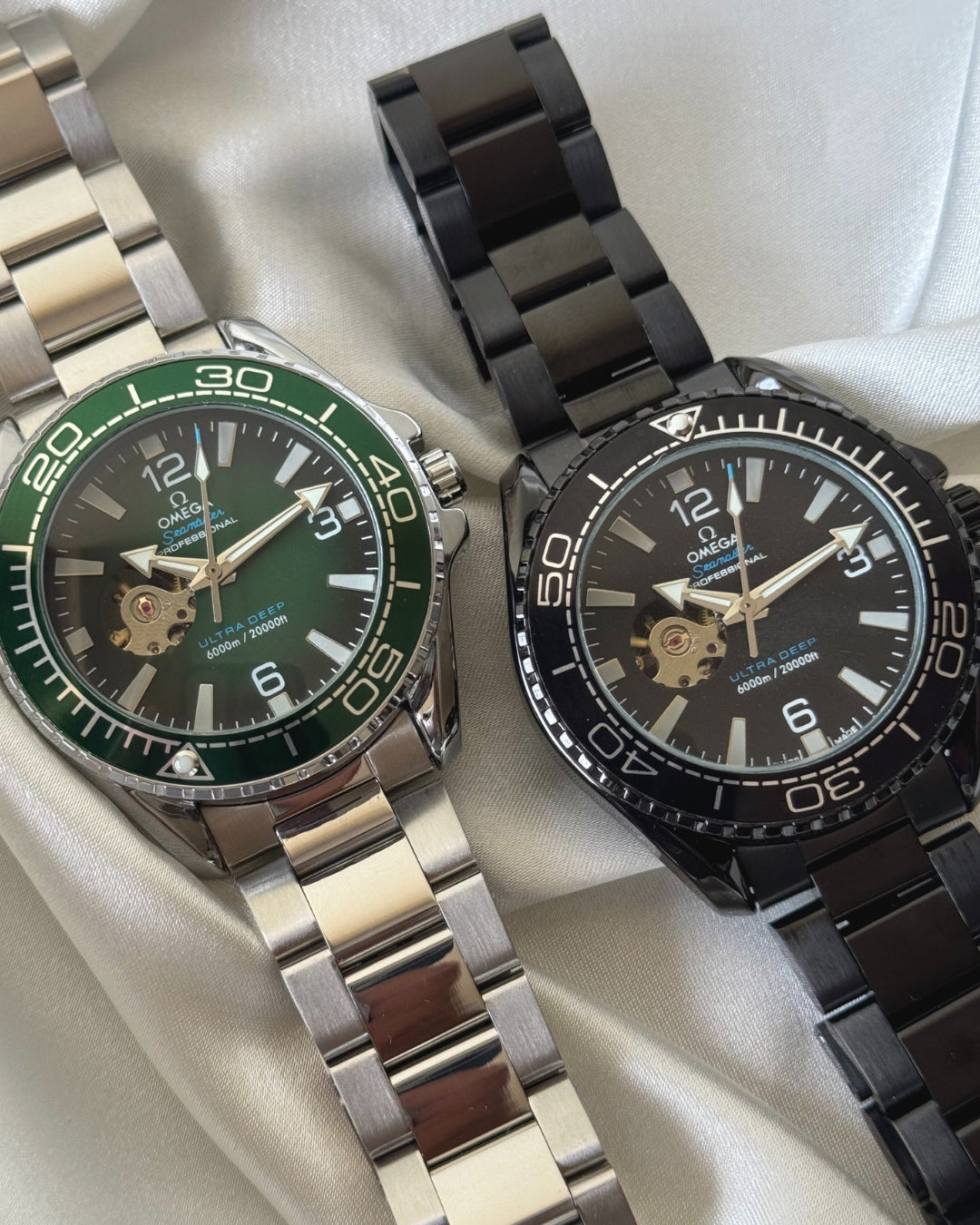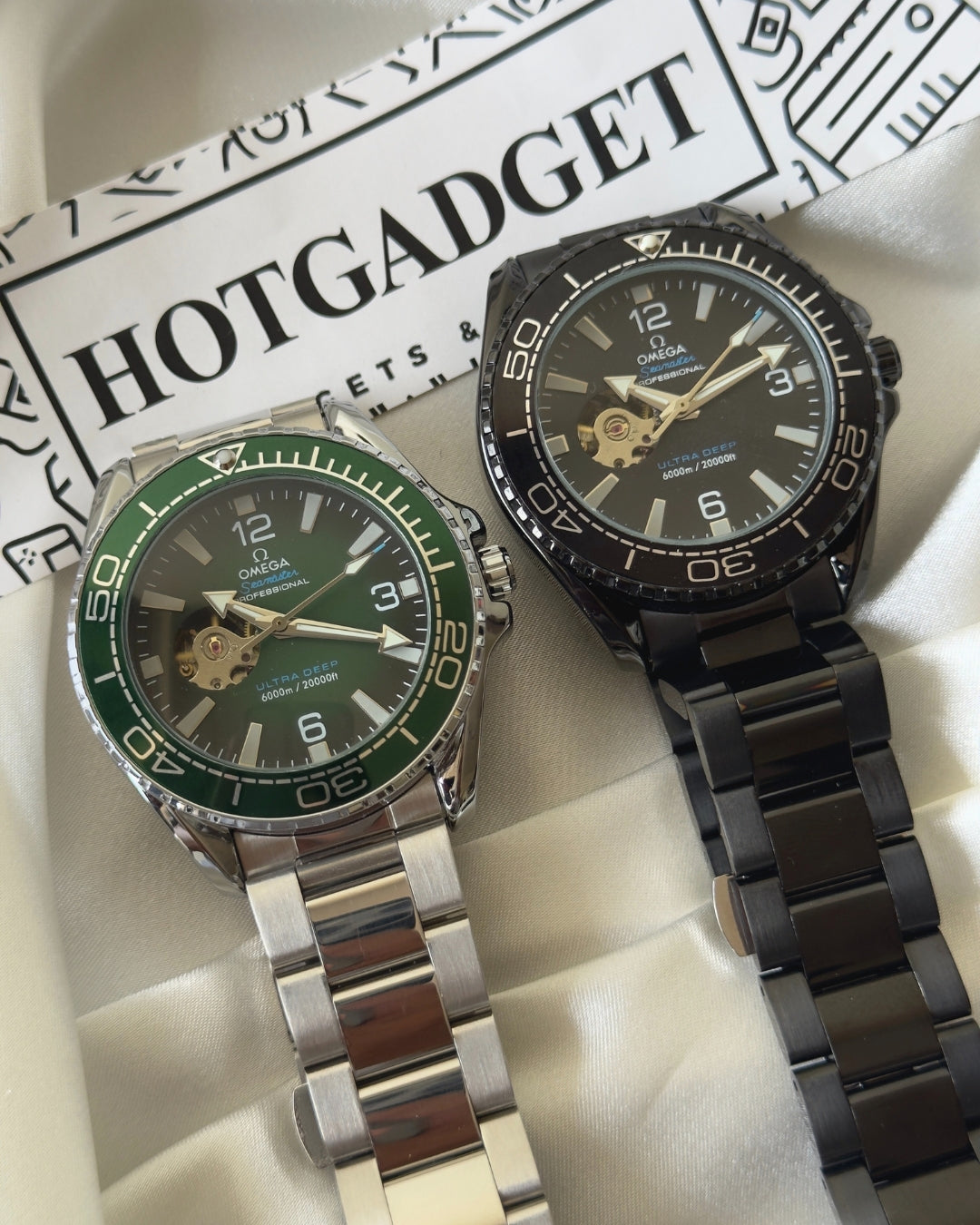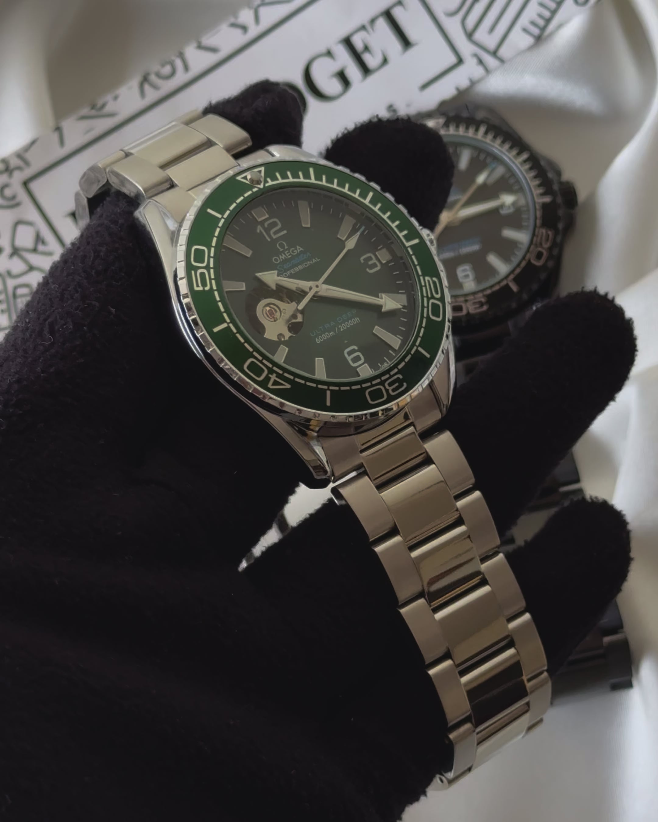 This Planet Ocean Chronograph Watch has a black dial and bezel with subtle orange accents, adding a pop of color to its sleek and sporty design.