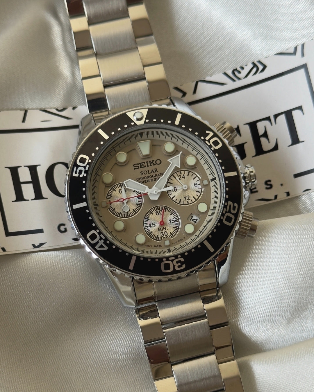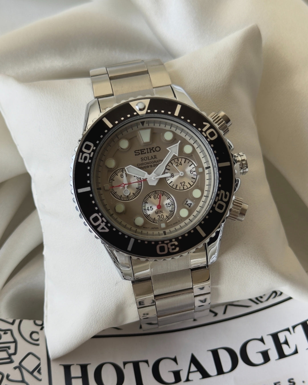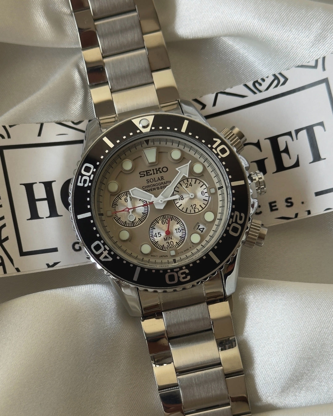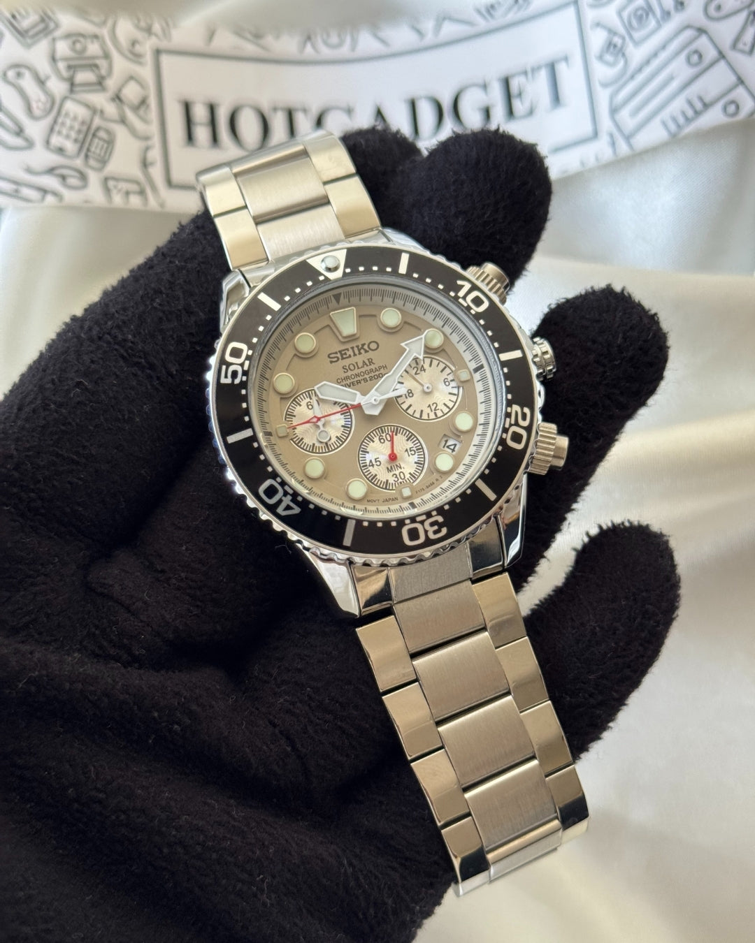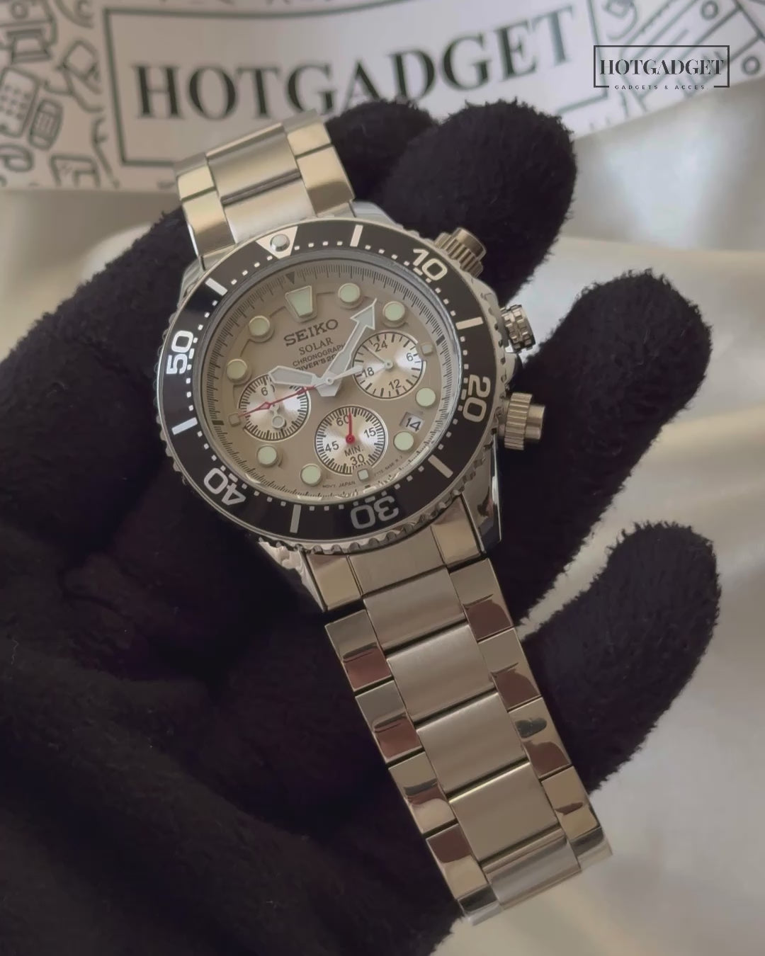 This Seiko Solar Prospex Chronograph Watch has a premium dial and bezel, adding a pop of color to its sleek and sporty design.